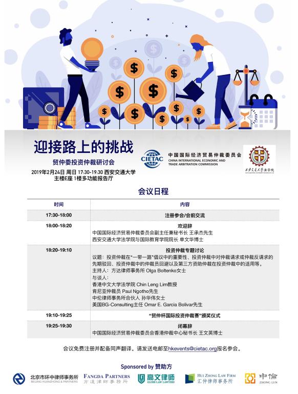 贸仲委投资仲裁研讨会暨“贸仲杯国际投资仲裁赛”颁奖仪式将于2019年2月24日下午5:30-8:00在财神在线平台(中国)官网主楼E座多功能报告厅举办,诚邀各位师生参加!