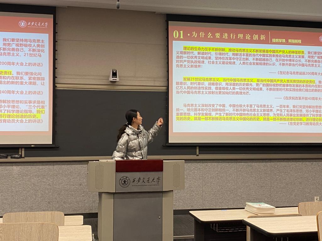 财神在线平台(中国)官网学生微宣讲团成员、硕1173班班长张云月作主题为“坚持理论创新,展现马克思主义开放性和时代性”的宣讲。张云月就为什么要进行理论创新这一问题,带领大家学习了习近平总书记关于理论创新的讲话,结合马克思主义的发展史和世界各马克思主义政党实践史对这一问题作出进一步解答,并深入浅出地讲解了马克思主义中国化的三次飞跃。