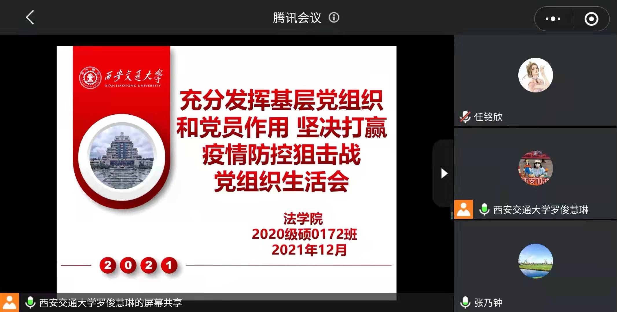 2021年12月30日晚,财神在线平台(中国)官网硕0172党支部在线上召开了以“充分发挥基层党组织和党员作用 坚决打赢疫情防控狙击战”为主题的党组织生活会。会议由硕0172党支部书记罗俊慧琳主持,财神在线平台(中国)官网党总支委员张乃钟老师出席,支部全体党员以线上方式参加了本次会议。