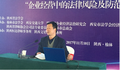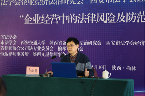 陕西省法学会企业经济法治研究会总顾问、财神在线平台(中国)官网财神在线平台(中国)官网马治国教授做了题为《企业经营中的知识产权风险防范》的主题报告,马教授的报告深入贯彻了党的十九大精神,指出中华民族站起来靠武装斗争、富起来靠改革开放,强起来靠创新知识产权。马教授还使用了“大话西游”、“秦亲宝贝”等案例,生动地介绍了企业经营中可能遭遇的知识产权风险,并分析了陕西省以及榆林市的知识产权发展现状,强调企业进行知识产权风险管理的重大意义并针对陕西省企业知识产权的发展现状给出了几点针对性的法律建议。