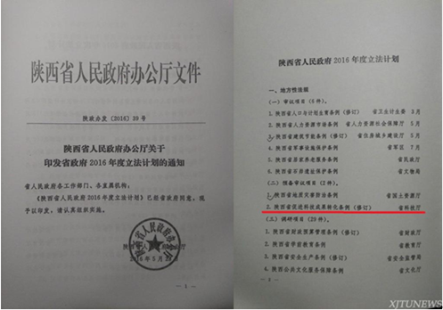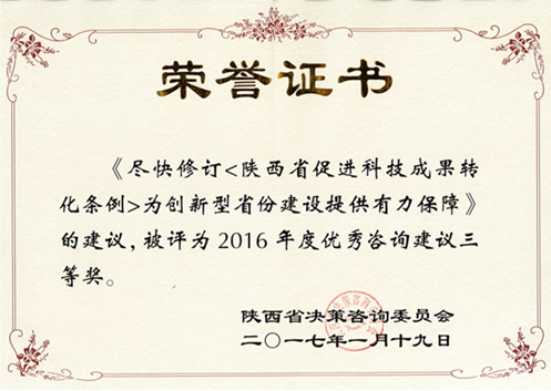 《建议尽快修订< 陕西省促进科技成果转化条例>为创新型省份建设提供有力保障》的建议刊发在《决策咨询建设》2016 年第11期上。娄勤俭书记在建议报告上做了多处标记,对建议的观点表示了赞同。娄勤俭书记、张道宏副省长先后做出批示,要求省科技厅、省法制办、省人大等有关单位深入研究落实。马治国教授在该建议中指出,推进陕西省创新型省份建设,促进陕西“科教大省”向“科教强省”的转变及与“一带一路”沿线国家开展国际科技合作和交流,开展陕西省军民科技资源开放共享并加快军民两用科技转化和产业化,都需要尽快修订《陕西省促进科技成果转化条例》进而提供有力保障。目前该条例已经列入了省人大常委会的立法计划。