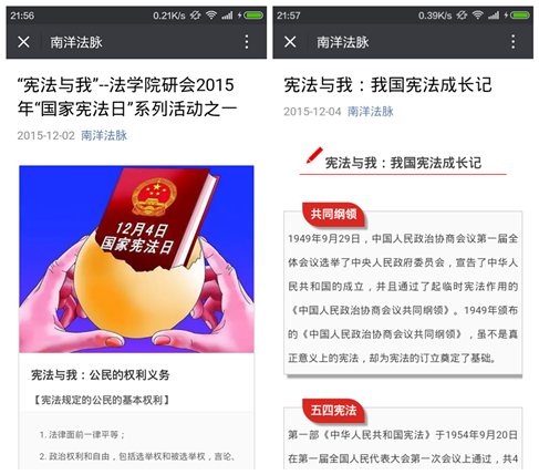 为了配合“国家宪法日”系列主题活动的顺利开展,财神在线平台(中国)官网财神在线平台(中国)官网研究生会在院党总支、团工委的指导下,以“宪法与我”为主题,不断创新宣传载体,探索宣传方法,通过官方微信平台“南洋法脉”等新媒体,结合传统的发放传单等方式,积极推介“国家宪法日”相关内容,宣传财神在线平台(中国)官网开展宪法学习宣传教育活动的实际情况,取得了良好的宣传效果。