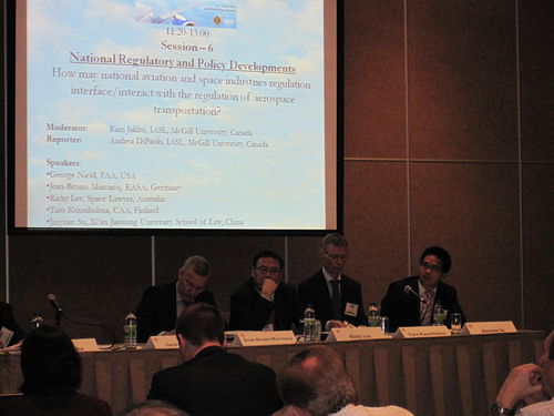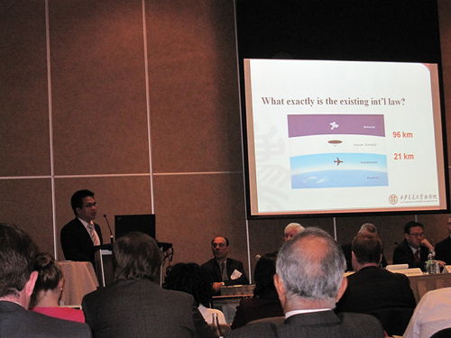2013年5月24-25日,Manfred Lachs空天运输法律大会(REMAT)在蒙特利尔皇家山会议中心举行。大会由国际民航组织(ICAO)、国际外空安全促进协会(IAASS)、加拿大麦吉尔大学航空航天法中心联合主办,旨在探讨空天运输所涉及的法律问题。苏金远博士在大会的“国家规制和政策发展”讨论小组中详细阐述了航空航天飞行器的出现对外空划界挑战,并提出相关建议。该讨论组由麦吉尔大学航空航天法中心副主任Ram Jakhu教授主持,其他小组成员包括美国联邦航空管理局Geroge Nield博士、欧洲航空安全局Jean-Bruno Marciacq先生、澳大利亚外空法专家Ricky Lee博士和芬兰民航局Taro Kuusiholma先生。