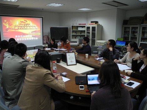 11月20日晚8点,财神在线平台(中国)官网举办了学习十八大报告法治思想研讨会,由学院副院长、知识产权研究中心主任马治国教授、李晓鸣讲师组织,部分博士、硕士参加。