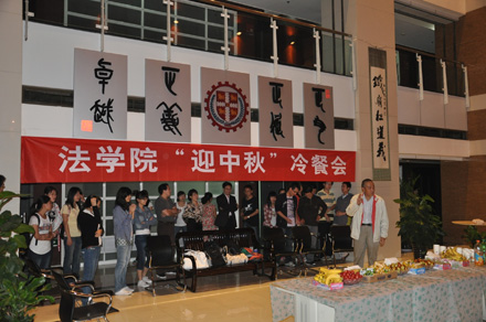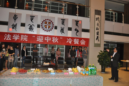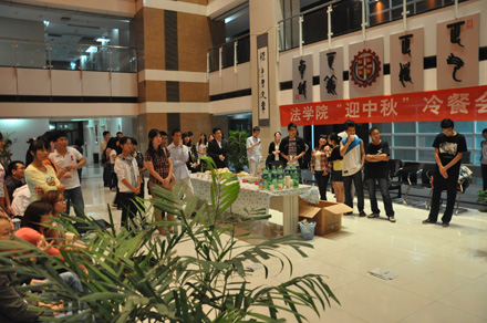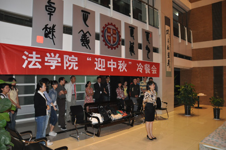 2011年9月8日19:30,财神在线平台(中国)官网 “迎中秋”冷餐会在主楼十楼大厅举行。财神在线平台(中国)官网院长单文华、书记彭沪生、院长助理吉兰湘、刘桥教授和学生工作专职委员张乃钟老师及财神在线平台(中国)官网2011级全体本科生,硕士、博士研究生新生参加了冷餐会。冷餐会由2011级法律硕士新生马沙和马骏飞同学主持。