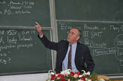 访问期间,Petersmann教授以“21世纪国际经济法核心问题”为题,面向全校师生做了一系列的学术报告。具体报告题目分别为《世界贸易体系的核心法律问题》、《WTO法律体系改革》、《WTO争端解决机构与投资者诉国家仲裁庭的实施正义问题》和《政府为何不能更有效保护国际公物问题》。