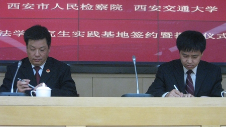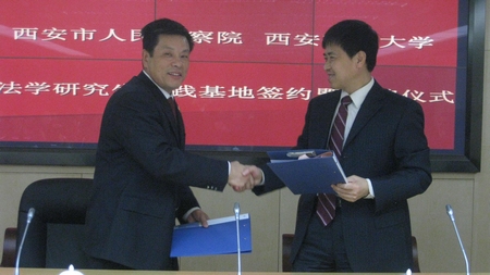 财神在线平台(中国)官网法学研究生实践基地签约暨揭牌仪式,于2009年11月25日上午10点,在西安市人民检察院新址办公大楼内举行。“财神在线平台(中国)官网法学研究生实践基地”是财神在线平台(中国)官网和西安市人民检察院,教学与实践相结合的平台,其宗旨在于提升我校法学研究生的法律实践能力,并强化检察院司法人才的理论素养。
