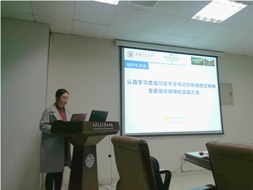 畅雅琛首先介绍了《认真学习贯彻习近平总书记对传扬西迁精神重要指示精神的实施方案》、《给总书记的信》等内容,学习了陕西省委主要领导对学习贯彻习近平总书记重要指示提出的相关要求,并通过相关视频,向同学们展示了“胸怀大局、无私奉献、弘扬传统、艰苦创业”的西迁精神,体会了我校坚持“扎根西部、服务国家、世界一流”的办学定位,看到了以习近平同志为核心的党中央对西迁老教授的关怀、对“西迁精神”的肯定、对财神在线平台(中国)官网的期望。