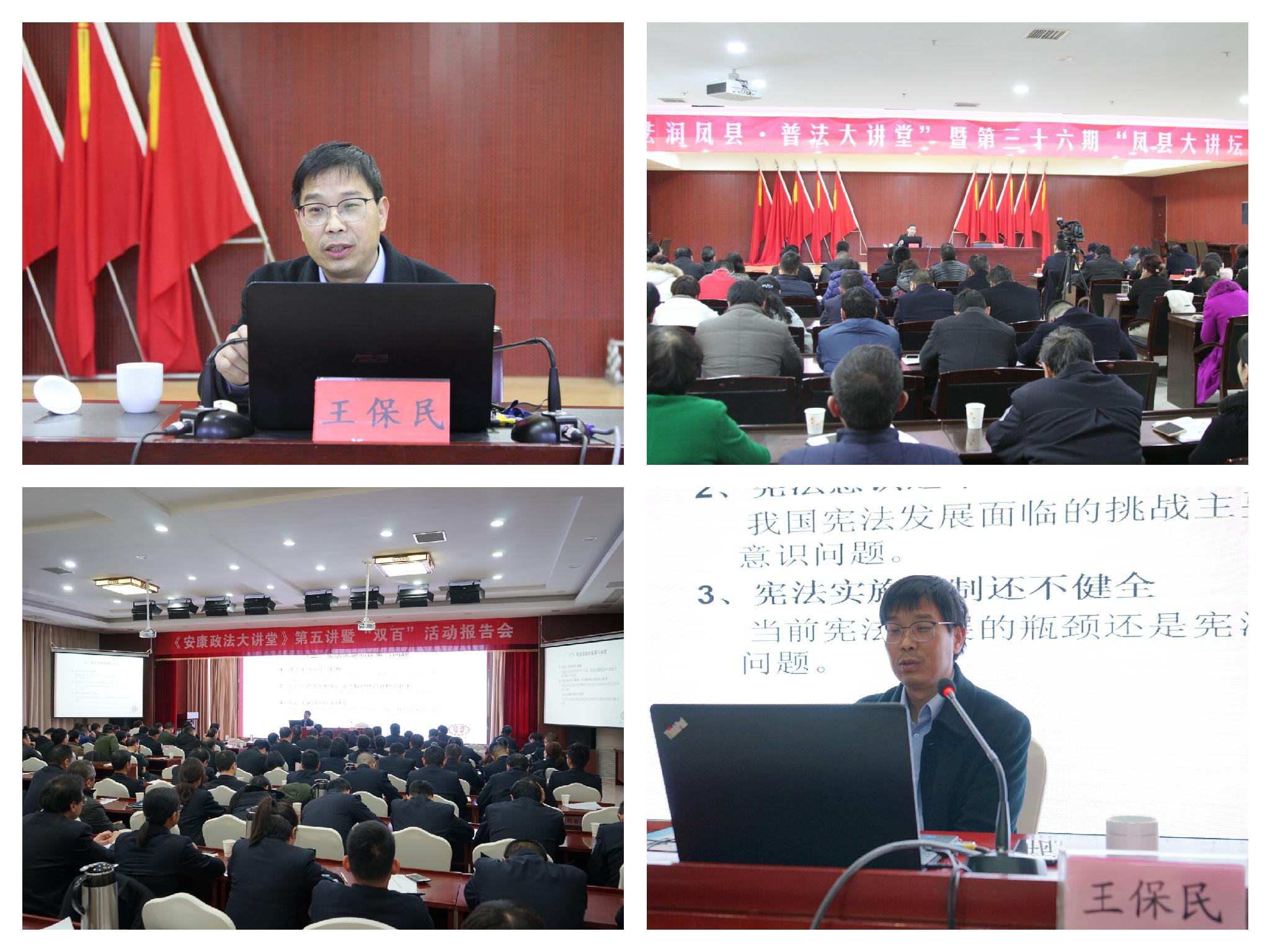 王保民教授受安康市委政法与凤县县委邀请,分别于12月4日与12月7日在安康市《安康政法大讲堂》与凤县《凤县大讲堂》做了以《树立宪法权威 推进依宪治国》和《法治思维与公务人员从政风险防范》为题的专题讲座。