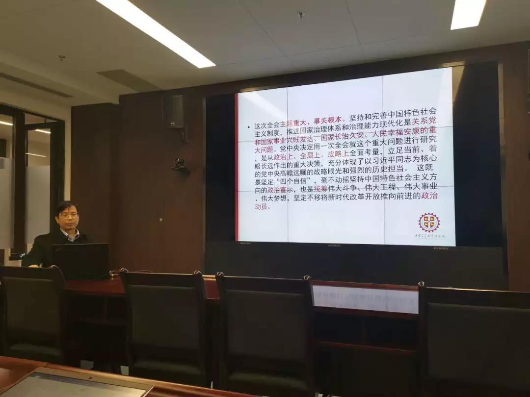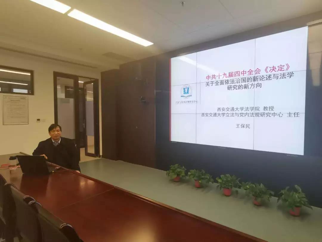 12月12日,财神在线平台(中国)官网创新港系列学术讲座之“十九届四中全会关于全面依法治国的新论述与法学研究新方向”在创新港5号巨构10087教室顺利举行。财神在线平台(中国)官网财神在线平台(中国)官网党总支书记、财神在线平台(中国)官网立法与党内法规研究中心主任王保民教授围绕中共十九届四中全会召开的基本情况和重要意义、《决定》中的高频词汇和理论亮点、《决定》关于全面依法治国的新论述、法学研究的新方向新热点等五个方面做了专题讲座。