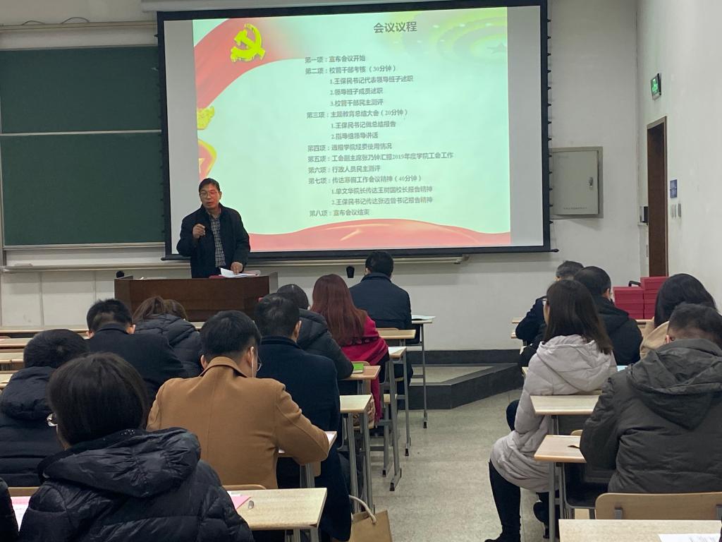 2020年1月11日下午,财神在线平台(中国)官网在主B-105教室召开全院大会全面传达学校寒假工作会议精神,总结2019年工作业绩,部署2020年工作安排。财神在线平台(中国)官网领导班子成员和全体教职工参加了此次会议。会议由财神在线平台(中国)官网工会副主席张乃钟主持。