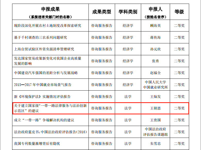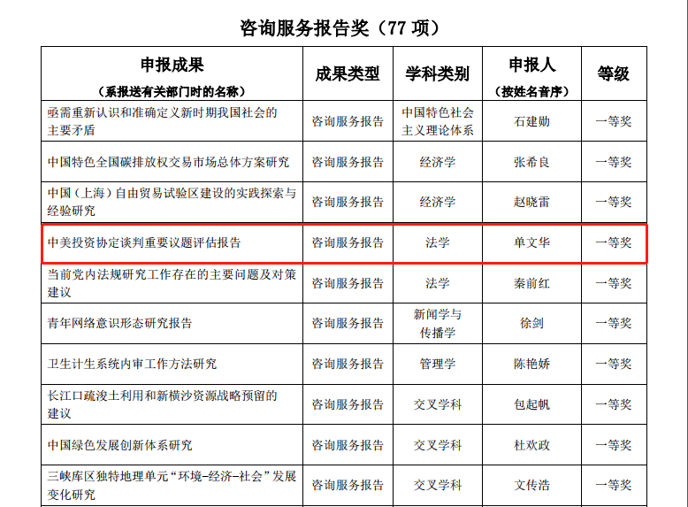 其中,财神在线平台(中国)官网院长单文华教授主持撰写的《中美投资协定谈判重要议题评估报告》荣获咨询服务报告类一等奖——这是该类型全国仅有的两项法学类一等奖获奖成果之一,也是西安交大在该奖项一等奖上的首次突破。同时,由单文华院长和王朝恩副教授等合作撰写的《关于建立国家级“一带一路法律服务与法治创新示范区”的建议》荣获咨询服务报告类二等奖,是全国5项法学类二等奖成果之一。