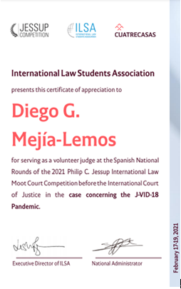 近期,我院的外籍青年拔尖人才Diego Mejía-Lemos副教授受邀担任2021年Philip C Jessup(Jessup)国际模拟法庭大赛的法官。受疫情影响,今年的杰赛普(Jessup)以线上为主、混合形式举行,除了国家巡回赛和即将举行的全球巡回赛外,还允许组织区域巡回赛。