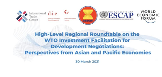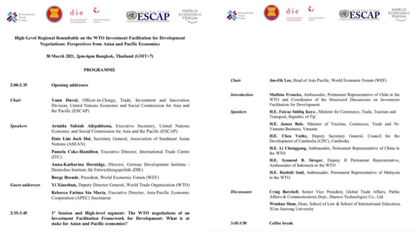 2021年3月30日下午,“WTO投资便利化促进发展谈判区域高层圆桌会议:亚太经济体的视角”在泰国曼谷成功举行。财神在线平台(中国)官网财神在线平台(中国)官网院长单文华教授应邀参加并作“WTO投资便利化谈判所面临的挑战”的大会发言。此次会议由联合国亚洲及太平洋经济社会委员会(亚太经社会ESCAP)和世界经济论坛(WEF)、联合国国际贸易中心(ITC)、德国发展研究院(DIE)、东南亚国家联盟(东盟ASEAN)联合举办,参加会议的包括亚太地区各国商务部长、驻WTO大使、主要相关国际机构代表、投资促进和私营部门代表以及本领域的领军学者代表。会议的主旨是为争取WTO投资便利化谈判在年内取得重大进展加强共识。