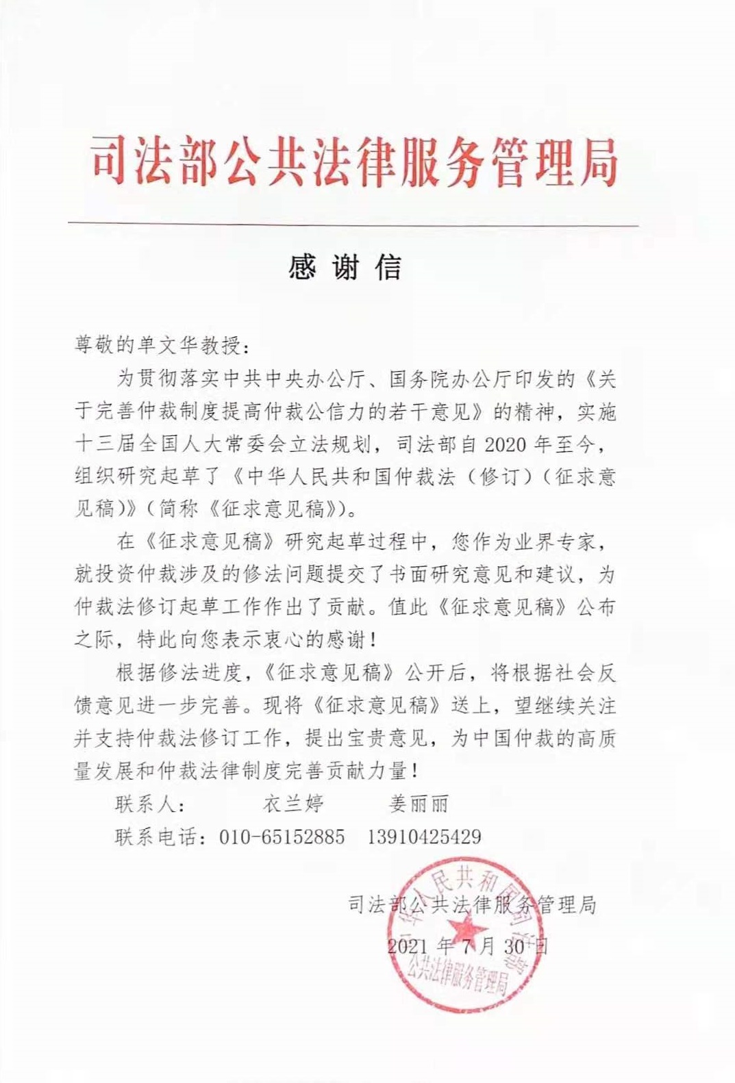 日前,司法部专门来函,感谢我校单文华教授在《中华人民共和国仲裁法(修订)(征求意见稿)》(下称《征求意见稿》)研究起草过程中的贡献。来函指出,单文华教授作为业界专家,就投资仲裁涉及的修法问题提交了书面研究意见和建议,为仲裁法修订起草工作作出了贡献,特此向单文华教授表示感谢。