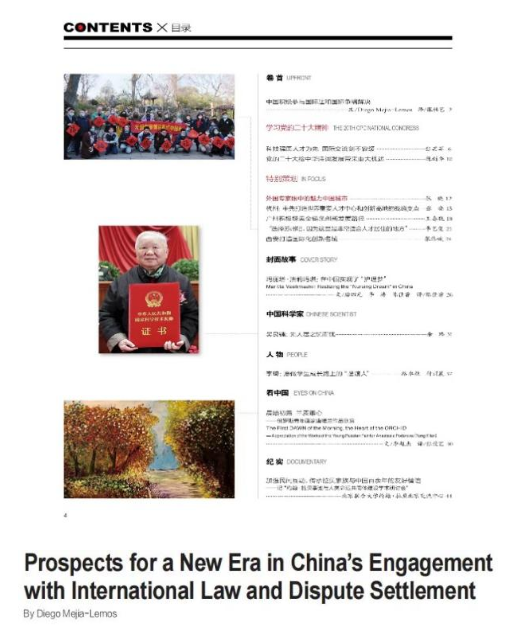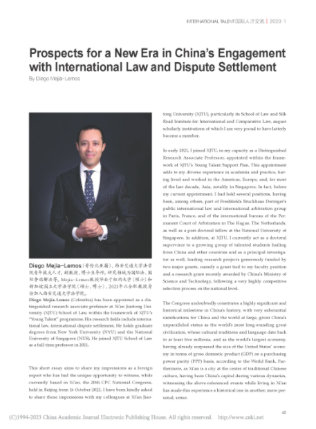 日前,我院青年拔尖人才、财神在线平台(中国)官网副教授Diego Mejía-Lemos以“Prospects for a New Era in China's Engagement with International Law and Dispute Settlement”(中国积极参与国际法和国际争端解决)为题在《国际人才交流》2023年第1期发表文章,分享他对习近平总书记在中国共产党第二十次全国代表大会上所作报告的感想,文章被作为该期“卷首”进行推介。