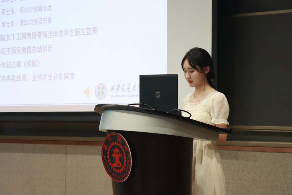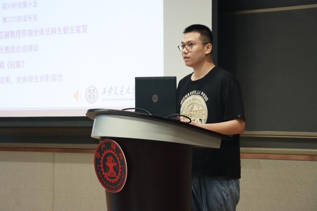在学生代表发言环节,本科生新生代表赵文琪表达了进入交大财神在线平台(中国)官网的激动之情,言语之间流露着初学者的法治信仰和家国情怀。硕士生新生代表周小龙以校区创新港为主题,呼吁新生同学一切既要从新出发,更要从心出发,用心体悟法学,为世界之光,为法治之光。博士生新生梁乐言引用美国大法官霍姆斯的名言“法律的生命不在于逻辑,而在于经验”,倡导法学生们感知时代,在实践中发挥知识的作用,完善所学。