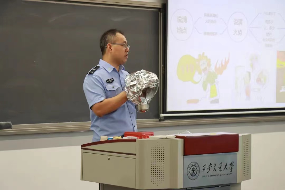 会上,保卫处刘豹虎老师应邀首先为同学们进行安全教育讲座,他以“你安全吗?”“你身边的环境安全吗?”和“你身边的人安全吗?”三个问题作为切入口,深入讲解了电动车事故的成因、电信诈骗的手段及防范技巧、火灾预防的方式,并现场展示了防烟面罩、灭火器的使用方法,他提醒同学们要在手机上安装“国家反诈中心”APP并向同学们强调国家安全是国家的基本利益,树立国家安全意识是公民的必修课,倡导并要求同学们要做遵纪守法的好公民。