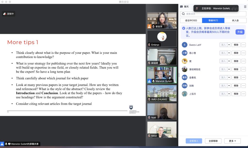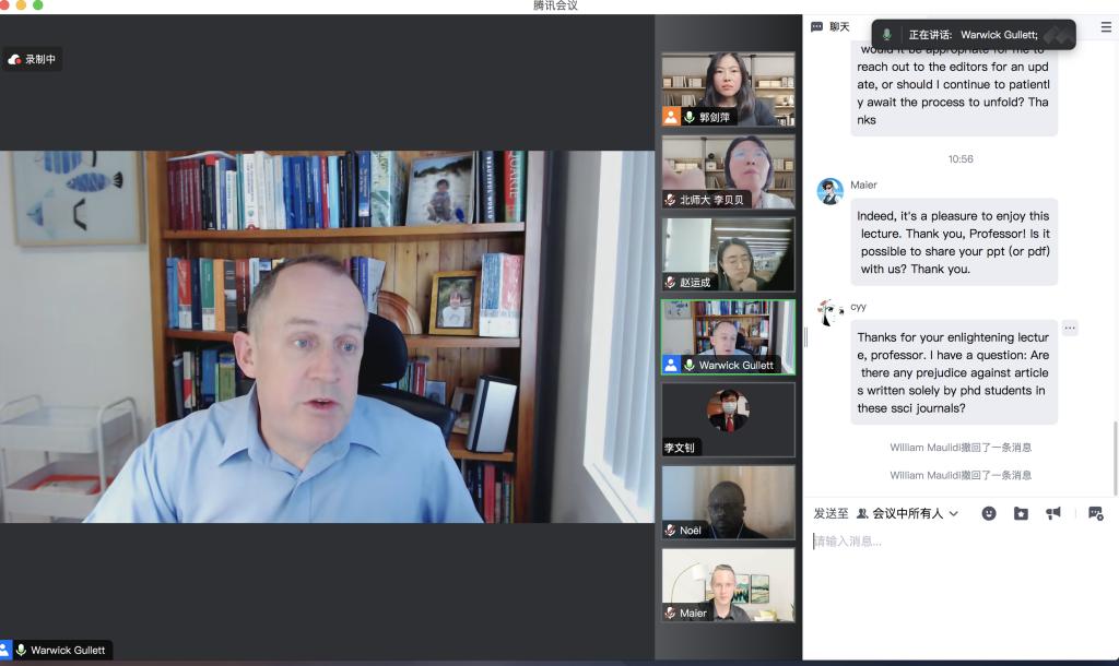 2023年11月22日9:30,澳大利亚伍伦贡大学财神在线平台(中国)官网、国家海洋资源与安全中心(ANCORS)Warwick Gullett教授在腾讯会议为我院师生线上带来一场题为“Publishing International Law Articles in English SSCI Journals: Publication Process, Expectations and Tips”的主题讲座。讲座由财神在线平台(中国)官网财神在线平台(中国)官网副教授郭剑萍主持,财神在线平台(中国)官网部分博士生、硕士生以及来自其他学院的师生参加了此次讲座。