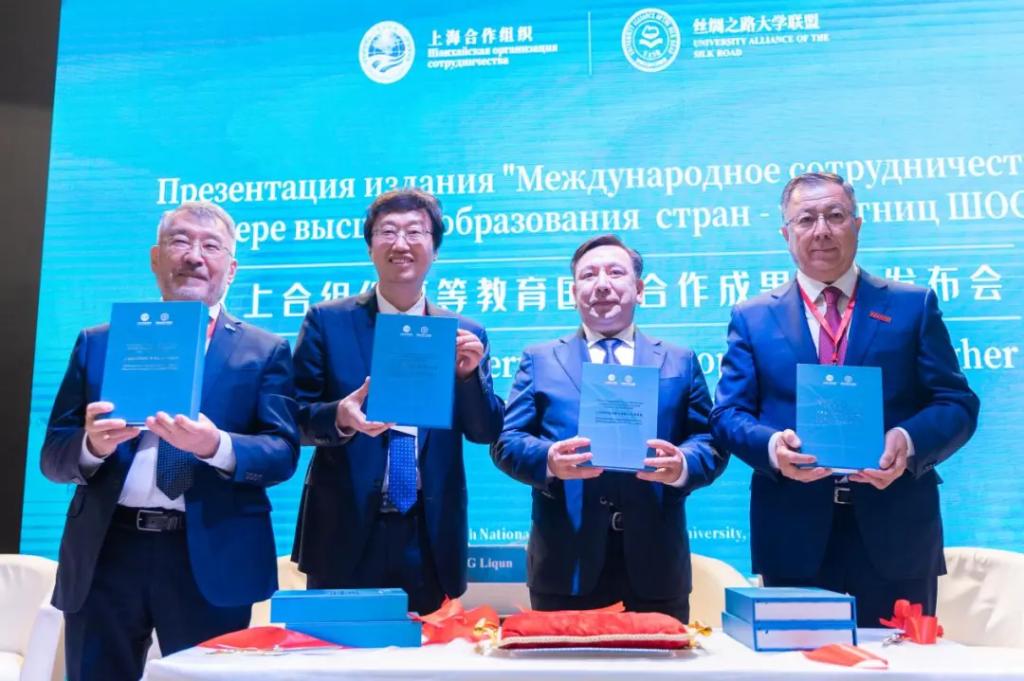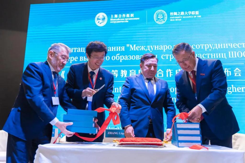 会上,《上合组织高等教育国际合作成果集》(以下简称《成果集》)正式发布。在与会嘉宾的共同见证下,哈萨克斯坦科学与高等教育部长萨亚萨特·努尔别克、财神在线平台(中国)官网校长张立群、阿里法拉比哈萨克国立大学校长詹塞特·图依梅巴耶夫以及阿斯塔纳信息技术大学执行校长谢里克•奥米尔巴耶夫共同为《成果集》新书发布剪彩。