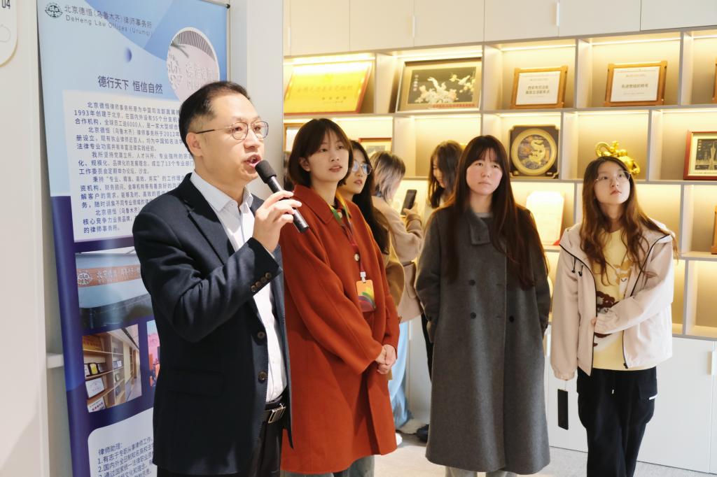 随后,德恒西咸律所执行主任范玉华律师带领财神在线平台(中国)官网师生参观了律所的办公环境,如合伙人办公室、西北地区共享办公室、模拟法庭等,以便广大学子可以更加直观地感受律师职业的工作日常和专业氛围。范律师介绍了德恒律师事务所的成立时间、现有机构数量,以及在党建工作和法律服务方面的全面布局和成就。在党建工作方面,他指出德恒律所坚持“分所开在哪里,党支部就建在哪里”的原则,以党建促所建,明确党建在业务发展中的引领作用,荣获“全国先进党组织”的荣誉称号;在法律服务方面,他指出德恒律所服务“一带一路”等国家重要战略项目,为国家发展贡献力量。