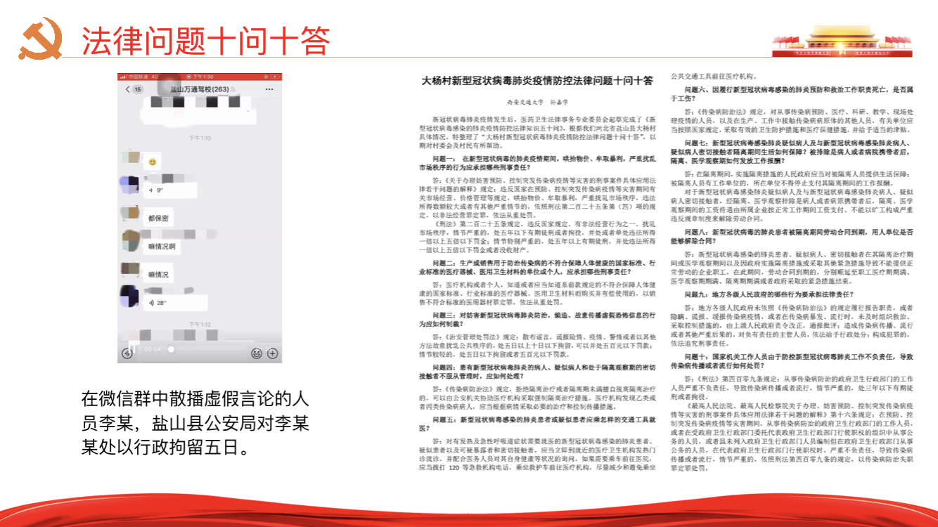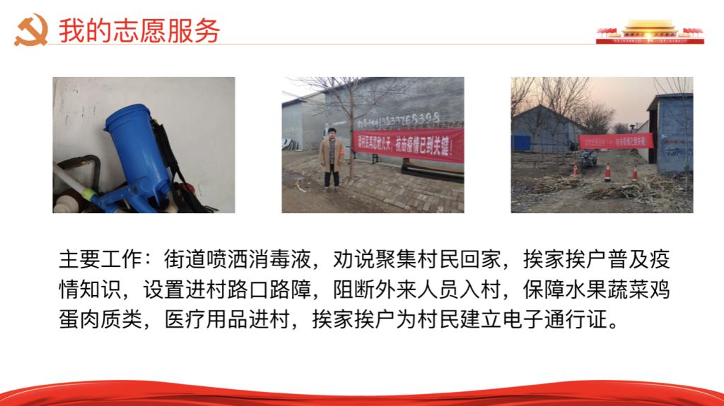 之后,支部入党积极分子孙嘉学同志为大家分享了自己担任抗击疫情志愿者的经历和感悟。孙嘉学同志谈到在疫情防控期间,自己撰写了《大杨村新型冠状病毒肺炎疫情防控法律问题十问十答》,利用专业所长为家乡村民开展相关普法宣传,提醒村民不信谣、不传谣。此外,他还与其他工作人员一起参与了为街道喷洒消毒液,劝说聚集村民回家,普及疫情知识,设置进村路口路障,阻断外来人员入村,保障水果蔬菜鸡蛋肉质类、医疗用品进村,为村民建立电子通行证等工作。