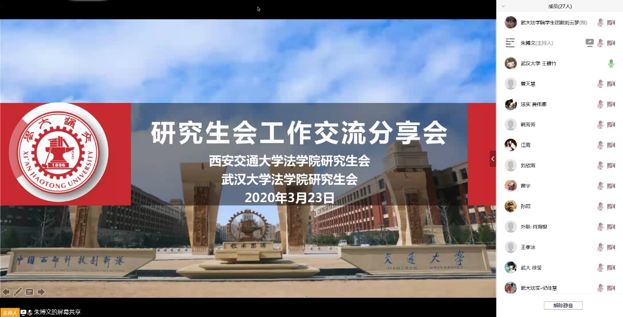 会议伊始,两院研究生会就组织建设、日常工作、精品活动、战疫工作等方面进行了交流。朱博文结合演示文档,图文并茂地向武大同学们介绍了西安交大财神在线平台(中国)官网研究生会的基本情况,研会作为学院党总支领导、团工委指导的综合性学生组织,是学院联系广大同学的桥梁和纽带,从文体、宣传、学术、心理等多个方面为同学们提供全面服务。根据团中央有关文件精神,学院去年对研会组织进行了精简,目前设主席、副主席各一人,分设组织部、宣传部与文体部三个部门,由研会主席、副主席以及部长共同管理,全体干事民主参与。研会先后举办了新港杯辩论赛、法律知识竞赛、冬至饺子宴、迎新冷餐会、元旦嘉年华以及疫情期间的“春之声”法律文化节等精品活动,受到同学们的广泛参与和高度评价,在校内外显著提升了学院的影响力。研会通过对外加强与兄弟院系研会的沟通协调,联合举办大型活动;对内与学院各党支部密切合作,由支部吸收动员入党积极分子参与活动,有效克服了交大财神在线平台(中国)官网学生规模较小,研会部门精简、人力有限对开展活动的制约。