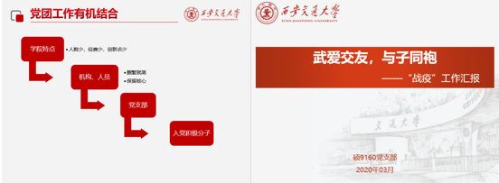 随后的党团工作交流环节,两院有关负责同学分别介绍了党团组织在抗疫期间的主要工作。交大财神在线平台(中国)官网硕9160党支部书记孙阳表示,财神在线平台(中国)官网各支部积极响应习近平总书记重要指示,落实党中央国务院决策部署,对标学校、学院防控要求;加强防疫宣传教育,引导学生带头守法;畅通信息报送渠道,保障日报制度运行;分享线上学习资源,配合做好线上授课筹备工作,号召同学在导师指导下深入研究疫情相关法律问题;倡导党员服务社区,组织党员捐款捐物。武大财神在线平台(中国)官网团委学生副书记刘云梦表示,自疫情发生以来,学院迅速成立以党委统一领导、统一指挥的疫情防疫工作小组,形成了党总支、党支部、党员个人三级联动的有力防控网络,从理论学习、思想引领、基层服务多领域开展抗疫工作。团支部积极响应,组织学习“青年大学习”团课,开展主题团日活动,鼓励团员青年积极投身防疫工作,发挥团员的生力军作用。
