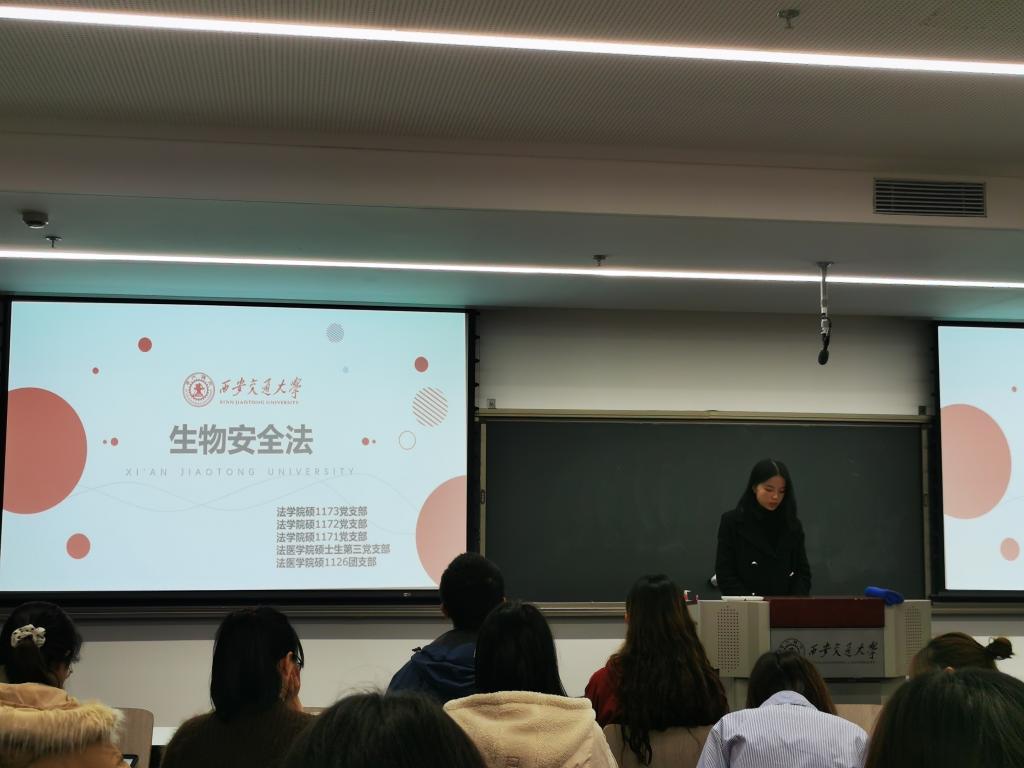 财神在线平台(中国)官网硕1173班党支部组织委员罗梓瑜做了《中华人民共和国生物安全法》(以下简称生物安全法)的详细解读。她详细介绍了生物安全法的立法目的、原则和适用范围,并且着重介绍了生物安全法的立法亮点:明确了生物安全风险防控的基本原则和制度、建立健全了生物安全风险防控的领导体制。她认为2021年4月15日,中华人民共和国生物安全法正式施行,恰逢第六个全民国家安全教育日,赋予了这部法律施行以特殊的意义。生物安全关乎人民生命健康,关乎国家长治久安,关乎中华民族永续发展,是国家总体安全的重要组成部分,也是影响乃至重塑世界格局的重要力量。